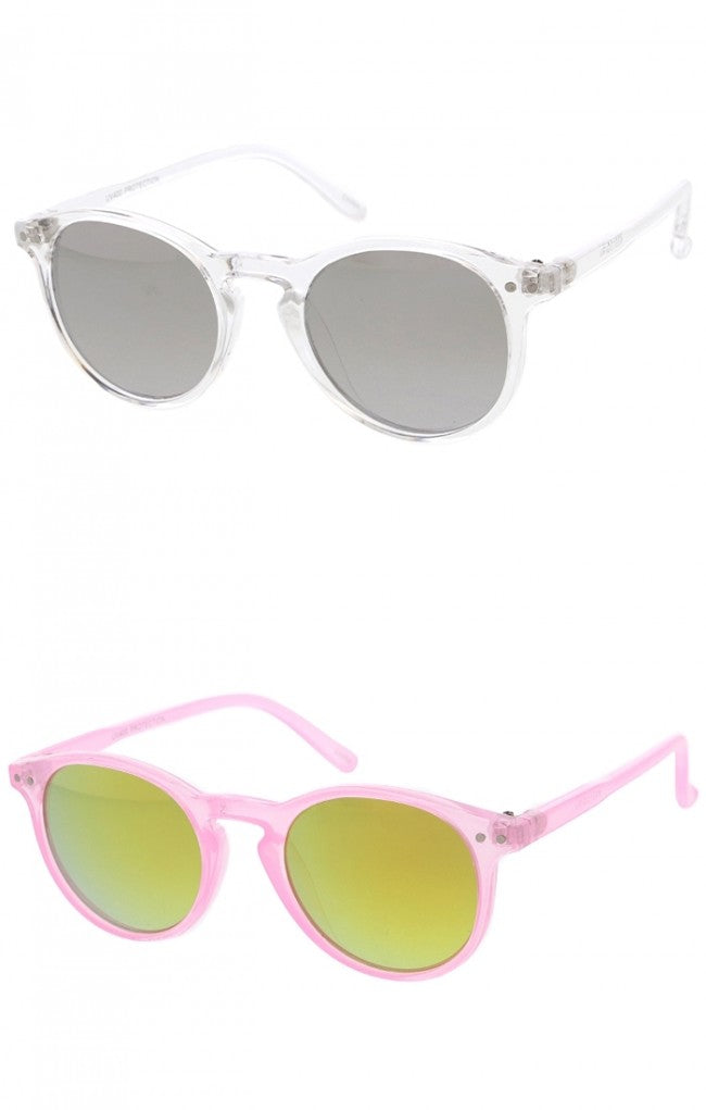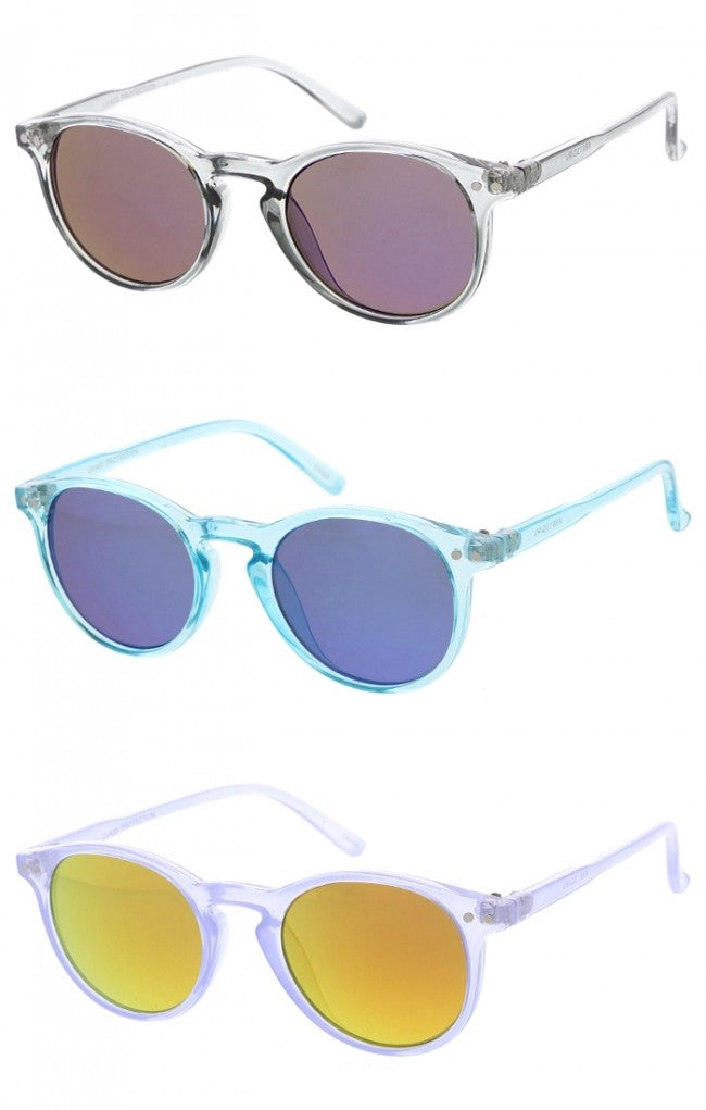 Retro Chic Sunglasses. Available in 5 Colors: Clear w/ Silver Mirrored Frames, Light Grey w/ Royal Mirrored Frames, Aqua w/ Royal Mirrored Frames, Sky Blue w/ Sunset Mirrored Frames, Pink w/ Sunrise Mirrored Frames